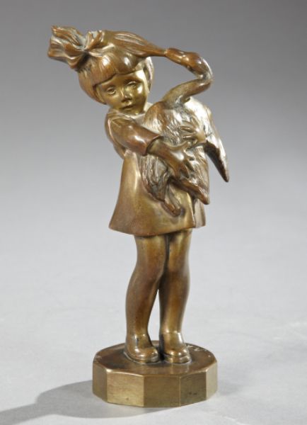 a patinated bronze sculpture of a child with a goose