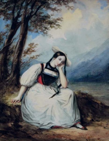 Swiss peasant girl resting by a tree