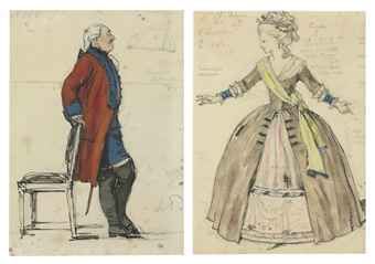 | Two costume designs for The Queen of Spades: A man in a red coat; and a girl at the ball | |