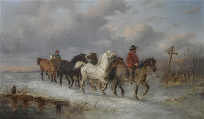 | Winterlandschaft mit Reitern und ihren Pferden auf dem Weg zum Pferdemarkt. | |