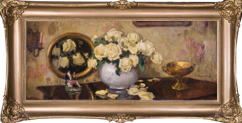 | MARTWA NATURA Z WAZONEM ŻÓŁTYCH RÓŻ, PATERĄ I PORCELANOWĄ FIGURKĄ | |
