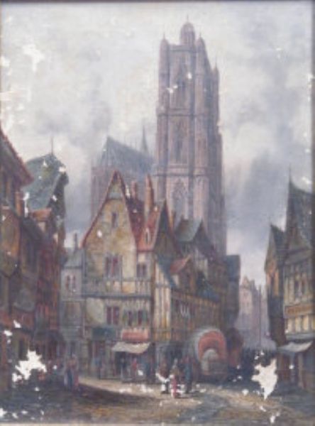 A continental street scene, a cathedral in the distance.