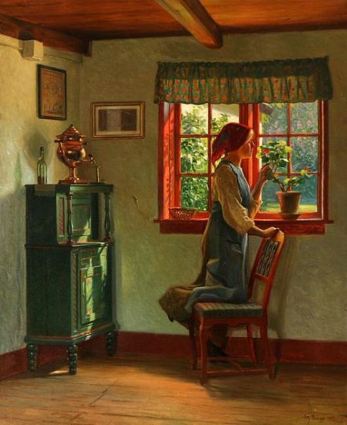 Country interior with a girl who smells a flower