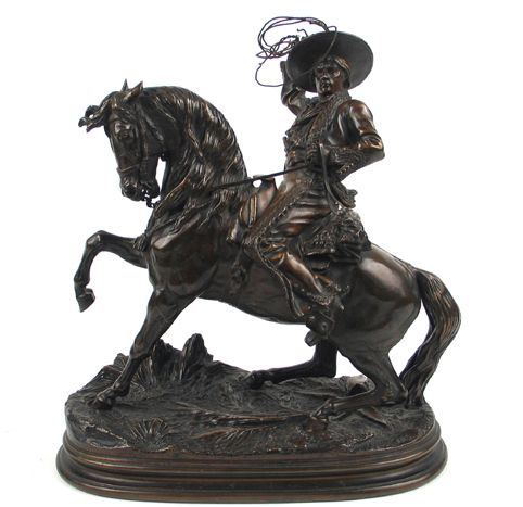 | a Spanish caballero in traditional costume with rope over head on prancing stallion, | |