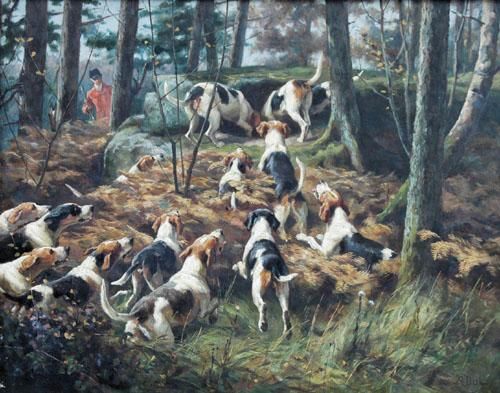 Hounds marking to ground in a wood