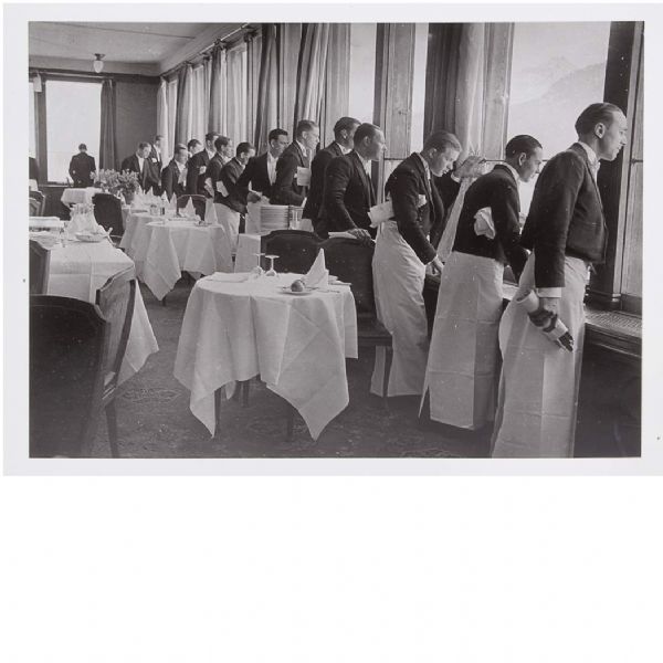 | Waiters of the Grand Hotel in St. Moritz, Switzerland watching Sonja Henie ice skating... | |