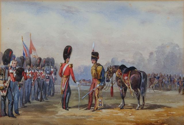 | A Coldstream Guard Officer and a Hussar Officer meeting in the middle of a field surrounded by their men | |