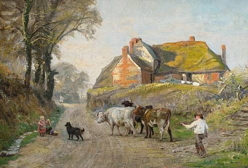 'Droving cattle through a village'