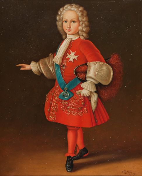 | Junger französischer Prinz in ganzer Figur, wohl Louis XV in rotem Rock mit weißem Jabot und Ordensstern. Unter dem linken Arm f | |