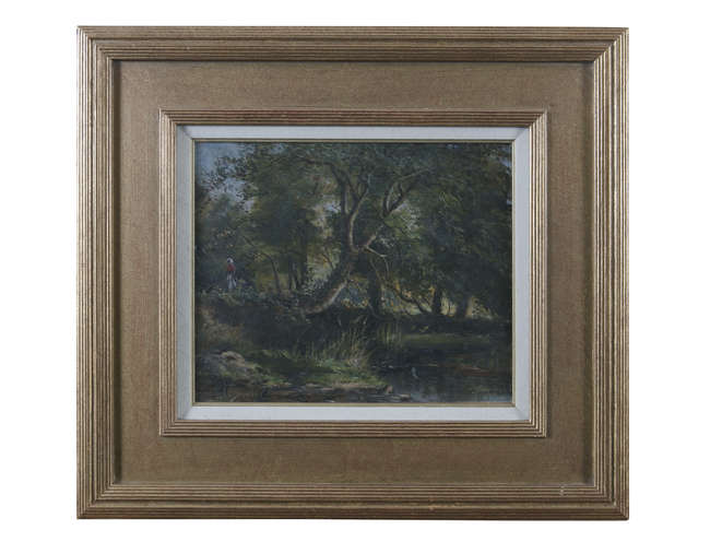 Wooded river landscape with lady walking