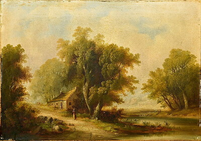 Figures Before a Thatched Cottage in a Rural River Landscape
