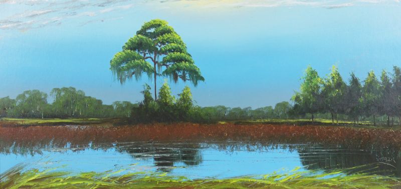 Florida Highwaymen moonlight backwaters scene with single tree stand and water