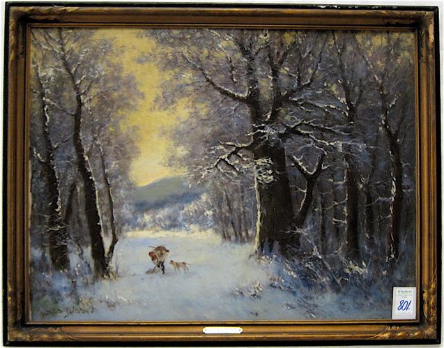 Winter landscape with hunter, dog and game