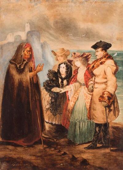 | Promeneurs au bord d’une falaise rencontrant une gitane | |