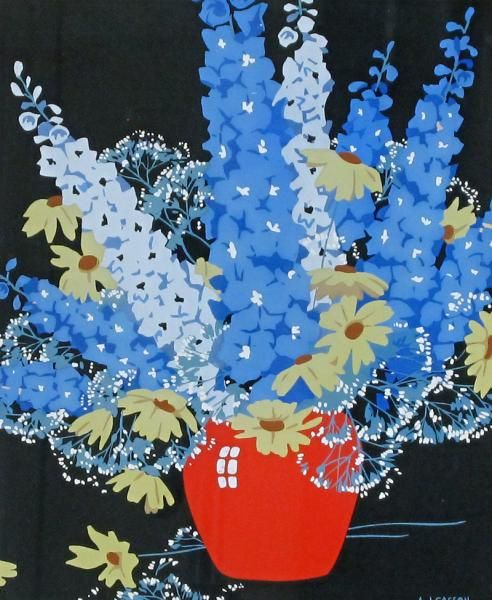 DELPHINIUMS AND DAISIES IN A RED VASE