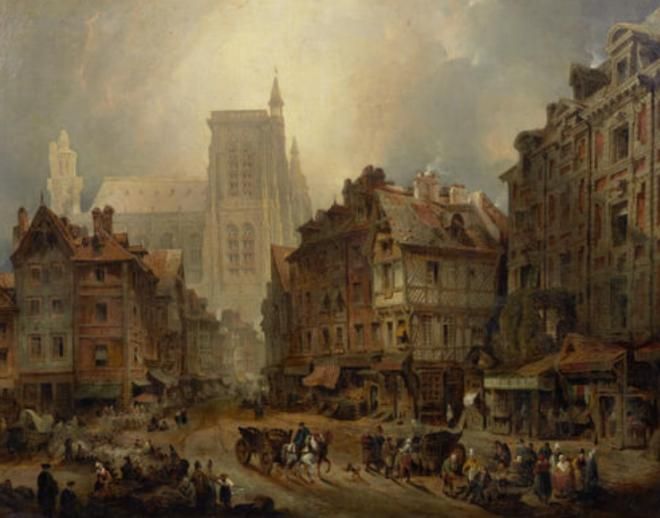 A market place in a Northern French cathedral town, possibly Rouen