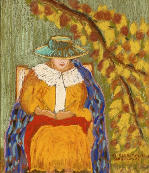 | Dorothea Mitchell Knitting Beneath a Peach Tree on the Artist's San Diego County Ranch | |