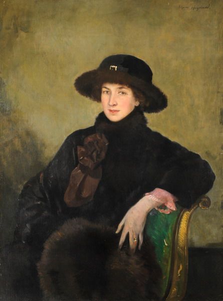 | Portrait of an Elegantly Dressed Lady, seated in a green chair, wearing a black fur-lined coat, fur hat and muff | |