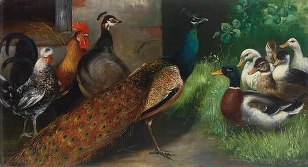 Pfau im Hühnerhof mit Enten, Hahn und Henne