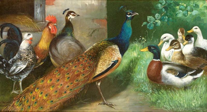 Pfau im Hühnerhof mit Enten, Hahn und Henne
