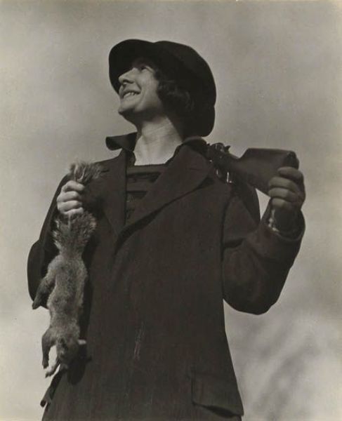 Ida O'Keeffe with rifle and squirrel