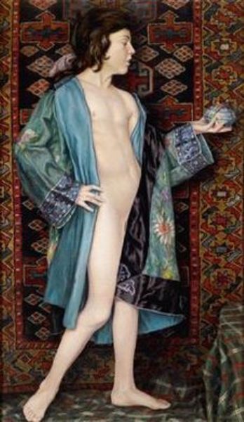 Nude Girl holding Pot and Standing in Front of a Kelim
