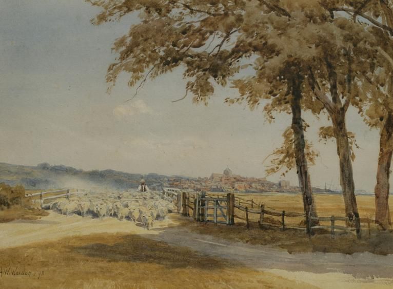 | Flock of sheep and shepherd on a lane with town by an estuary in the distance | |