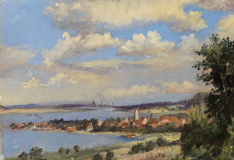 Blick vom Bodanrücken über Kirchdorf auf den Bodensee, im Hintergrund Konstanz.