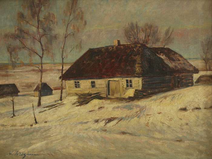 hatched farmhouse in a wintry landscape