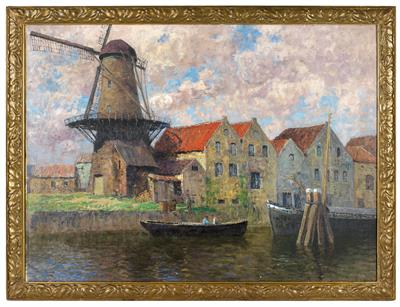 Holländische Hafenstadt mit Fischerboten und Windmühle