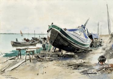 Barcos e figuras junto à margem do Tejo