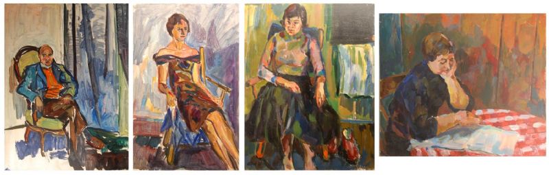 | Four portraits: 1) Woman seated in a chair, 2) Man seated in a chair, 3) A woman seated at a table, 4) Portrait of a young girl, | |