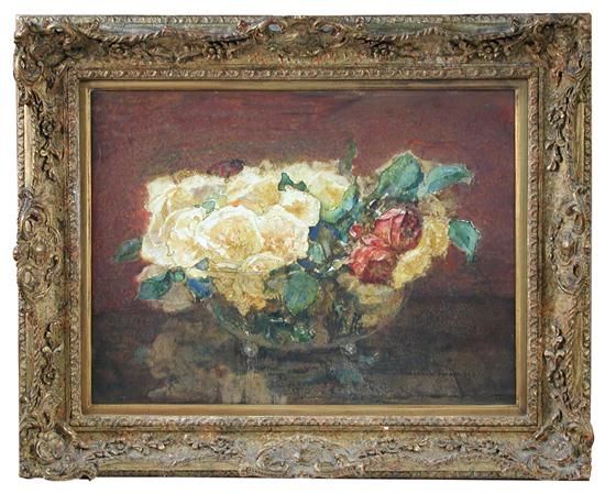 Still Life of Yellow and Pink Roses in a Silver Bowl