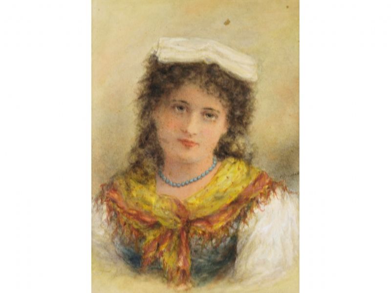 | Portrait of a young lady, shoulder length wearing a red and yellow shawl and white headpiece | |
