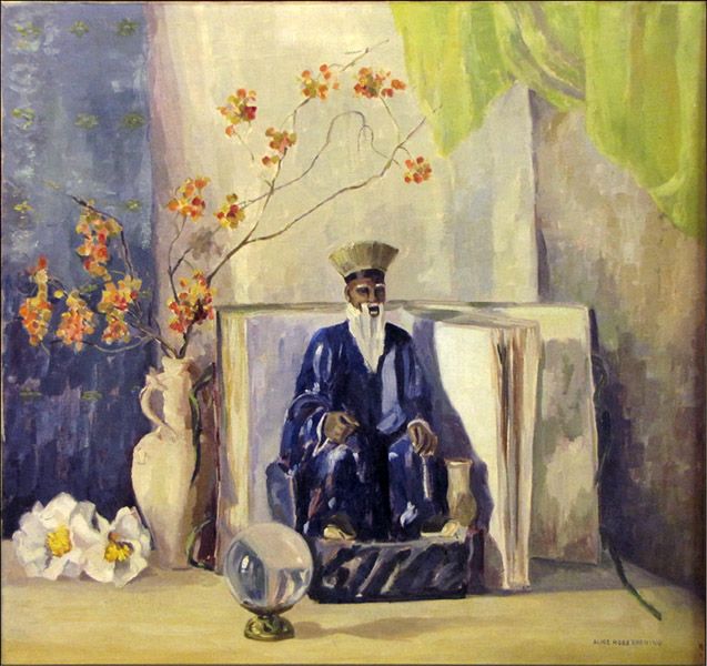 STILL LIFE WITH BOOK, CERAMIC FIGURE AND CRYSTAL BALL.