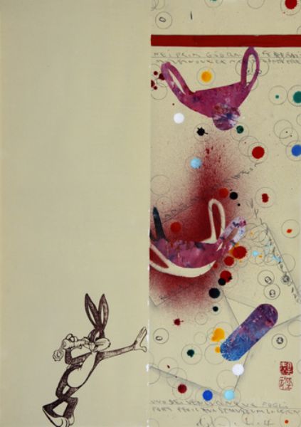 | Pencil gouache, spray technique, collage and stamp on paper | |