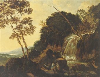 | A mountainous river landscape with peasants resting with their flock near a waterfall | |