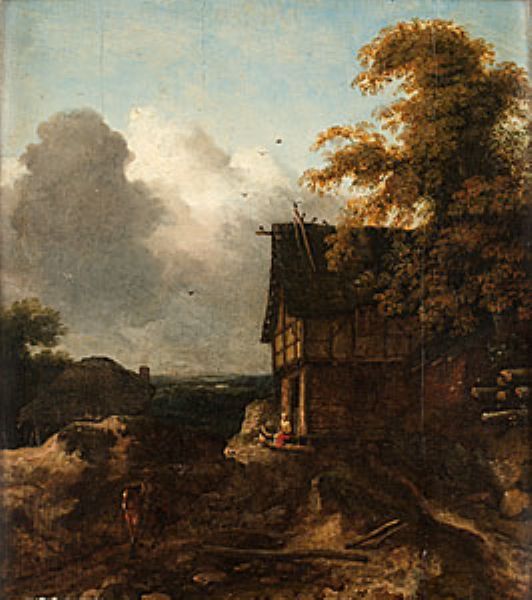 LANDSKAP MED KORSVIRKESBYGGNAD OCH FIGURER.