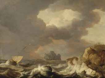 Shipping on stormy waters near a rocky coast