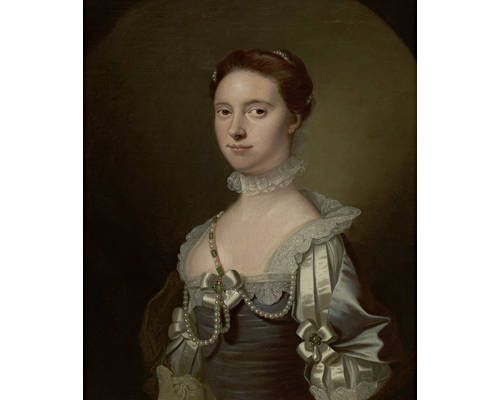 Barbara, Lady Johnstone of Westerhall, in a blue grey dress