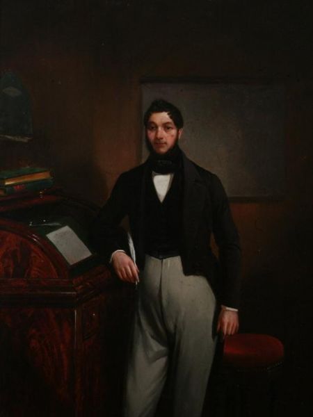 ELEGANT GENTLEMAN STANDING AT DESK WITH QUILL PEN