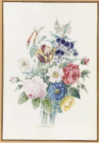 | Un bouquet avec des roses, des églantines, une marguerite, un aster, un géranium, une immortelle et une tulipe | |