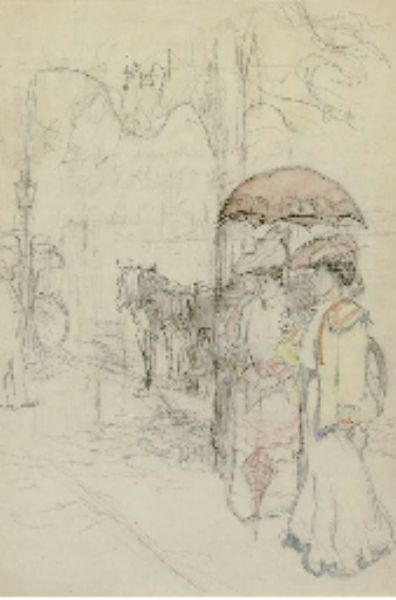 | Elegant ladies out for a stroll; and A woman in fright | |