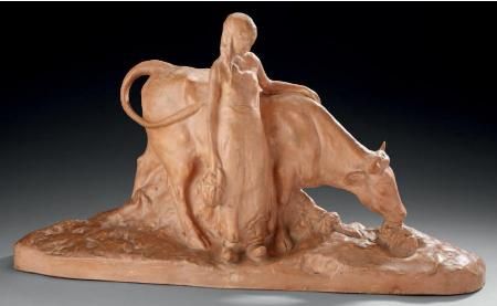 Terre cuite patinée figurant une laitière et une vache