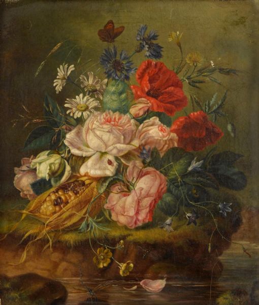 STILL LIFE OF MIXED FLOWERS AND INSECTS ON A MOSSY BANK