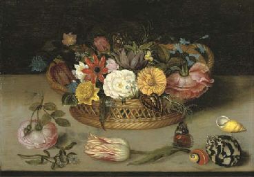 | Roses, tulips and other flowers in a basket with flowers, shells, and a butterfly on a ledge | |