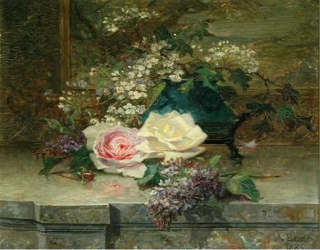 | Still Life of Cherry Blossoms, Roses and Lilacs on a Ledge | |