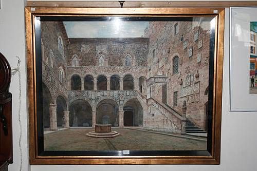study of a courtyard in the Bargello Palace, Florence, signed lower right