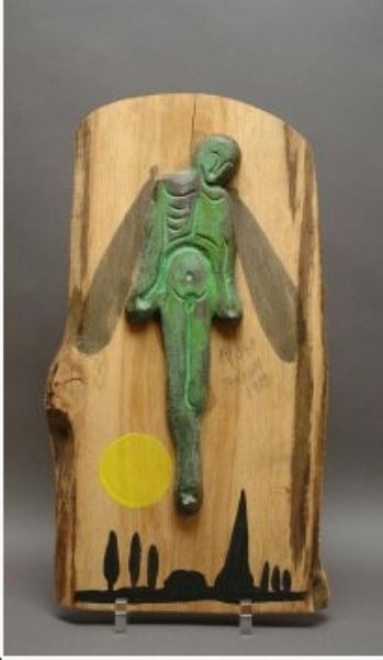 Bronze greenish patinated, on polychromed wood board