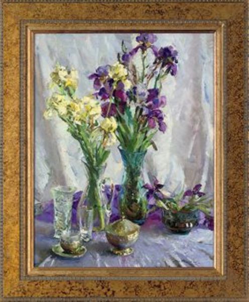 White and purple irises in glass vases